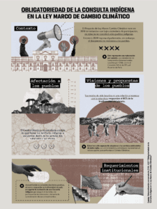 En agosto del 2020 el Grupo Interlinea coordinó el conversatorio “Obligatoriedad de Consulta indígena en la Ley Marco de Cambio Climático: Contextos y Discusiones”. Este contó con la moderación de Rosario Carmona, investigadora del CIIR y con las presentaciones de Alberto Curamil. Lonko de Comunidad Mapuche y premio Goldman de Medio Ambiente; Ximena Cuadra Montoya, Doctora en Políticas Públicas, Universidad de Quebec; Felix Queupul. Ingeniero Agrícola. miembro de Mesa Comunal Autónoma Mapuche de La Florida y deñ Centro de Negocios Indígenas; y Pilar Moraga. Investigadora de la línea de Gobernanza (CR)2. Los resultados de este conversatorio fueron graficados en una infografia, con las principales ideas de la jornada.